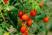 Dojrzałe naturalne pomidory rosnące na gałęzi w gospodarstwie.