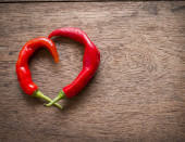 Od czerwonej gorącej papryki chili wyłożone postać w kształcie serca z oczami. Drewniane tło z miejscem na tekst
