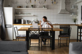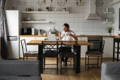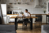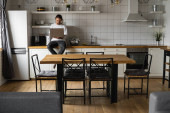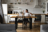 Zdjęcie "Młody wolny strzelec odniósł sukces w projekcie pracującym w domu. Cieszę się, że młody wolny strzelec triumfuje z podniesionymi pięściami. Zwycięzca euforii szczęśliwy człowiek za pomocą laptopa w biurku w domu. Udany brodaty mężczyzna." może być wykorzystywane do celów osobistych i komercyjnych zgodnie z warunkami zakupionej licencji Royalty-free. Obraz jest dostępny do pobrania w jakości wysokiej rozdzielczości do 5760x3840.