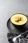 Zdjęcie "Miska z grubą zupą z małży, ozdobiona owocami morza, tymiankiem i pieprzem. Szare tło kamienia. " może być wykorzystywane do celów osobistych i komercyjnych zgodnie z warunkami zakupionej licencji Royalty-free. Obraz jest dostępny do pobrania w jakości wysokiej rozdzielczości do 5760x3840.