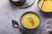 Miska z grubą zupą z małży, ozdobiona owocami morza, tymiankiem i pieprzem. Szare tło kamienia.