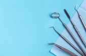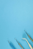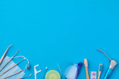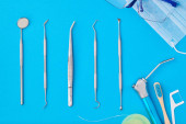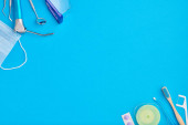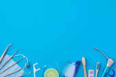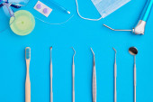 Narzędzia dentystyczne na niebieskim tle widok z góry ksero przestrzeń płaska leżał. Pielęgnacja zębów, higiena jamy ustnej i koncepcja zdrowia.
