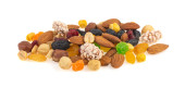 Orzechy - migdały, orzechy laskowe, nerkowce i suszone owoce. Zdrowa żywność bogata w minerały i witaminy. Dietetyczna i zdrowa. Zdrowy styl życia. Właściwa koncepcja żywienia.