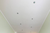 biały sufit stretch salonu z lampą. słoneczny, czysty dzień. widok z parapetu