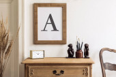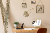 Beżowy stół z różnymi detalami wnętrza, wystrój wnętrz