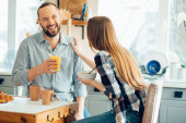 Radosny mężczyzna i kobieta trzymający kubki siedząc w kuchni i rozmawiając