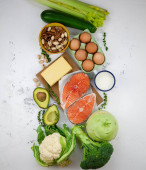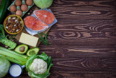 Zdjęcie "Ketogenic niskowęglowodanowej koncepcji diety. Zestaw produktów zdrowej zrównoważonej żywności. Zielone warzywa, awokado, orzechy, łosoś, jajka, przetwory mleczne. Koncepcja zdrowej żywności. Drewniane tło, top vie" może być wykorzystywane do celów osobistych i komercyjnych zgodnie z warunkami zakupionej licencji Royalty-free. Obraz jest dostępny do pobrania w jakości wysokiej rozdzielczości do 5760x3840.