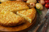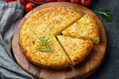 Hiszpański omlet z ziemniakami i cebulą, typowa hiszpańska kuchnia. Tortilla espanola. Rustykalne ciemne tło