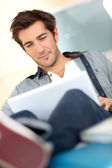 student w kampusie relaksujący z laptopa