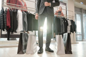 Portret szczęśliwego przystojnego młodego biznesmena niosącego torby na ramię podczas robienia zakupów w centrum handlowym