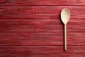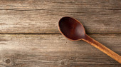 pusta brązowa łyżka drewniana na szarej drewnianej powierzchni ze starych desek, widok z góry