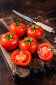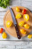 Świeżo pokrojony pomidor wiśniowy na desce do krojenia. Białe tło. Widok z góry.