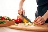 Pojęcie zdrowego odżywiania, kobieta kroi świeże warzywa do sałatki