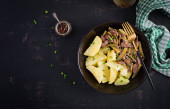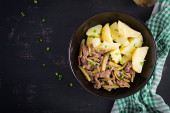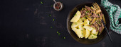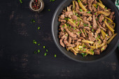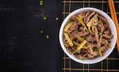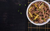 Gulasz wołowy, kawałki wołowiny duszone w sosie sojowym z przyprawami z ogórkiem marynowanym w azjatyckim stylu. Widok z góry, nad głową, płaski