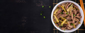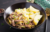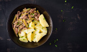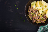 Gulasz wołowy, kawałki wołowiny duszone z marynowanym ogórkiem w rosyjskim stylu. Stroganow wołowy i gotowane ziemniaki. Widok z góry, nad głową, płaski