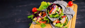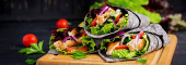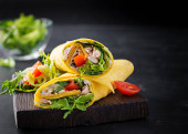 Świeże tortille zawinięte w kurczaka i świeże warzywa na drewnianej desce. Burrito z kurczaka. Meksykańska kuchnia. Przestrzeń kopiowania