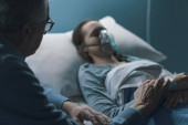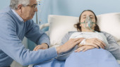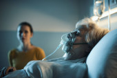 Starszy mężczyzna siedzący obok jej córki w szpitalu i pomagający jej w nocy, śpi i nosi maskę tlenową.