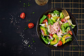 Zdjęcie "Sałatka z tuńczyka z sałatą, pomidorami wiśniowymi, awokado i czerwoną cebulą. Zdrowe jedzenie. Kuchnia francuska. Widok z góry, przestrzeń do kopiowania, układanie płaskie" może być wykorzystywane do celów osobistych i komercyjnych zgodnie z warunkami zakupionej licencji Royalty-free. Obraz jest dostępny do pobrania w jakości wysokiej rozdzielczości do 5760x3840.