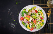 Sałatka z tuńczyka z sałatą, pomidorami wiśniowymi, awokado i czerwoną cebulą. Zdrowe jedzenie. Kuchnia francuska. Widok z góry, przestrzeń do kopiowania, układanie płaskie