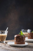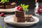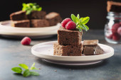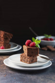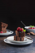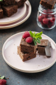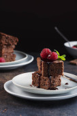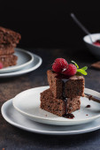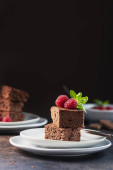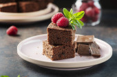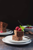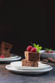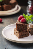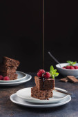 Ciasto czekoladowe z karmelem, maliną i miętą, selektywny obraz ostrości