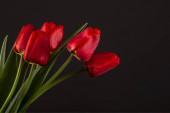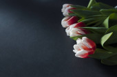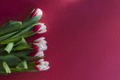 Bukiet różowych i białych tulipanów płasko leżał na różowym tle. Tulipan sortuj Candy Apple Delight w słońcu. Zbliżenie, płytka głębia ostrości, miejsce na tekst