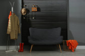 Wnętrze przedpokoju ze stylowymi meblami, ubraniami i akcesoriami