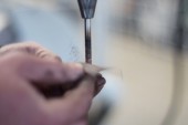 Naprawy złota biżuteria. Ręce złotnika z narzędzia i biżuterii na białym tle.