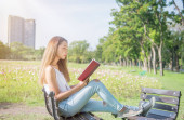 Młoda kobieta relaksująca się w parku naturalnym. Urlop i urlop w ogrodzie.
