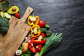 Płaska kompozycja układania ze świeżymi produktami na szarym stole. Zdrowe gotowanie