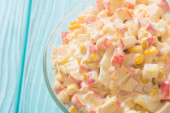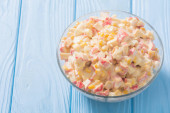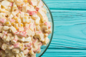 Tradycyjna rosyjska sałatka noworoczna z paluszkami krabowymi, kukurydzą, jajkami i majonezem