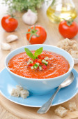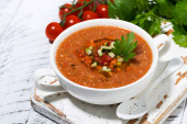 zimna zupa pomidorowa w misce, widok z góry