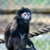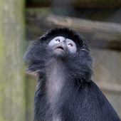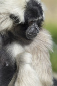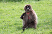 Macaque ogoniasty (Macaca silenus) siedzący na trawie w słońcu