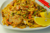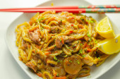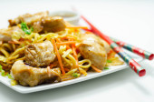 Gotowane kawałki piersi kurczaka z słonym czosnkiem i imbirowym sosem sojowym i makaronem, grzyby czarne, kapusta savoy i marchew, chińskie jedzenie