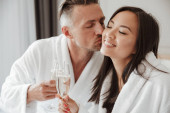 Obraz szczęśliwej namiętnej pary pijącej czerwone wino z kieliszków podczas romantycznej kolacji przy świecach w domu