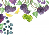 Akwarela ręcznie malowane natura świeże jagody zestaw z fioletowy jeżyna, jagoda, czerwona truskawka, wiśnia, porzeczka, czarna porzeczka, grpe i zielone oliwki kolekcji izolowane na białym tle