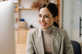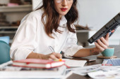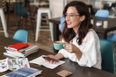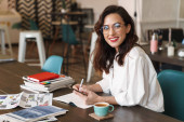 Zdjęcie "Piękny uśmiech młoda brunetka studiuje siedząc w kawiarni wewnątrz, robiąc notatki, czytając" może być wykorzystywane do celów osobistych i komercyjnych zgodnie z warunkami zakupionej licencji Royalty-free. Obraz jest dostępny do pobrania w jakości wysokiej rozdzielczości do 5760x3840.