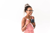 Zdjęcie wesołej młodej kobiety w okularach pijącej kawę na czerwonym tle ściany.
