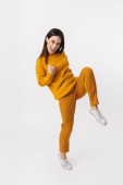 Zdjęcie "Full length image of beautiful brunetka dorosła kobieta zaciskając pięści i świętując zwycięstwo izolowane na białym tle" może być wykorzystywane do celów osobistych i komercyjnych zgodnie z warunkami zakupionej licencji Royalty-free. Obraz jest dostępny do pobrania w jakości wysokiej rozdzielczości do 5760x3840.