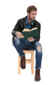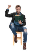Szczęśliwy człowiek casual czytania książki i wskazując do przodu, uśmiechnięty siedząc na krześle na białym tle studio