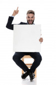 Happy casual mężczyzna gospodarstwa billboard i uśmiech siedząc na krześle na białym tle studio