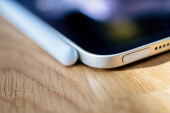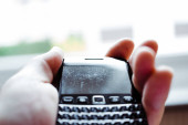 mężczyzna ręka gospodarstwa w dłoni vintage jeżyna profesjonalny smartfon z naciskiem na logotyp z tilt-shift obiektyw