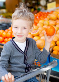 Cute little boy w sklepie spożywczym lub supermarkecie wybierając świeże pomarańcze organiczne. Zdrowy styl życia dla młodej rodziny z dziećmi
