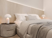 wnętrza nowoczesnej luksusowej sypialni z marmurową ścianą, tło 3d rendering