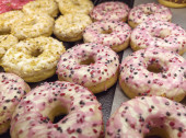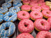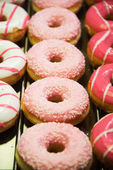 Wiele różnych czekoladowych pączków cukru wyświetlacz na sprzedaż .