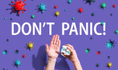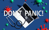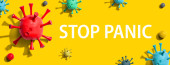 Kobieta w masce trzymać arkusza z napisem Stop Panic na niebieskim tle z abstrakcyjnych szczepów wirusa czerwonego. Rozpowszechnianie wiadomości i dezinformacji online na temat Coronavirus Covid-19 w mediach społecznościowych
