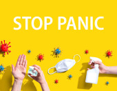 Zdjęcie "Kobieta w masce trzymać arkusza z napisem Stop Panic na niebieskim tle z abstrakcyjnych szczepów wirusa czerwonego. Rozpowszechnianie wiadomości i dezinformacji online na temat Coronavirus Covid-19 w mediach społecznościowych" może być wykorzystywane do celów osobistych i komercyjnych zgodnie z warunkami zakupionej licencji Royalty-free. Obraz jest dostępny do pobrania w jakości wysokiej rozdzielczości do 5760x3840.