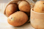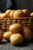 Młody ziemniak, deska, ręcznik i nóż na drewnianym tle, zbliżenie