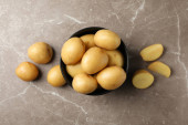 Miska z młodym ziemniakiem na szarym tle, widok z góry