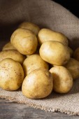 Torba papierowa z młodym ziemniakiem na drewnianym tle, miejsce na tekst