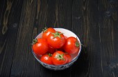 Płyta dojrzałych pomidorów na drewnianym tle planszy w studio